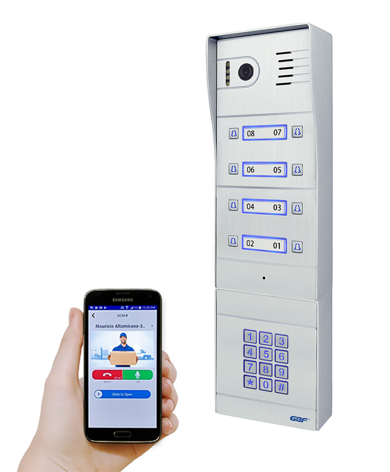 GBF Sentrylink full IP smart video doorbell system PL963PM8U-POE with RFID card reader is the solution for a smart access control system for 8 units apartment buildings.